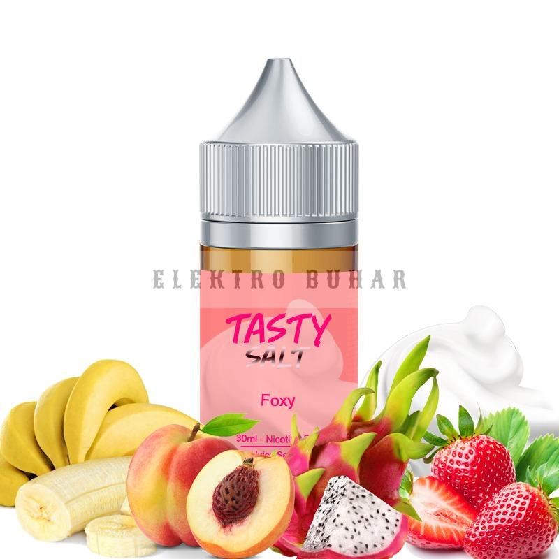Tasty Foxy Salt Likit 30ml İçerik: Tatlı çilek, muz, krema, ejder meyvesi ve şeftalinin lezzetli bir kombinasyonu olan Foxy, tatlı ve meyveli bir likit sunar.