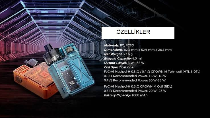 Crown M Pod, kompakt boyutları, güçlü performansı ve kullanıcı dostu özellikleriyle dikkat çeken bir elektronik sigara cihazıdır. Boyutları 82,3 mm x 52,6 mm x 26,8 mm olan bu cihaz, kullanıcılarına taşıması kolay bir deneyim sunar. 1000mAh batarya kapasitesi ile uzun süreli kullanım imkanı sunar.