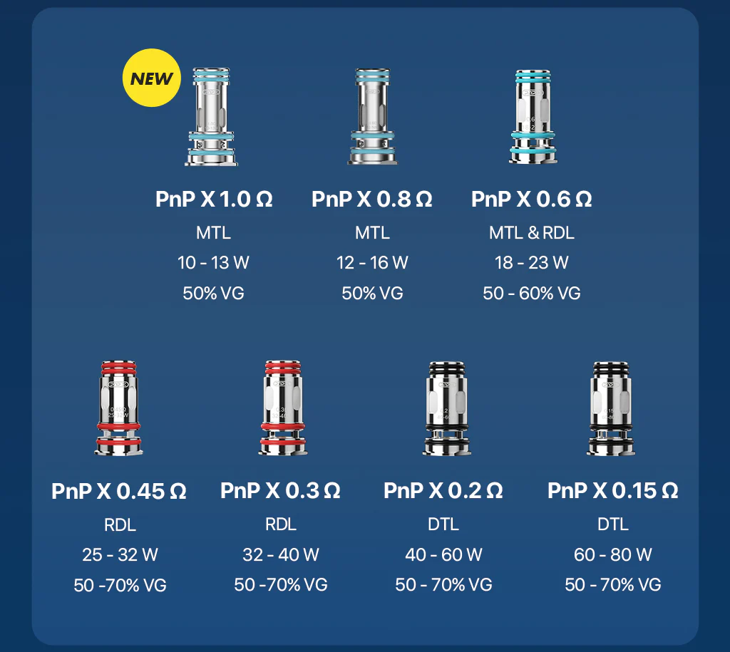 | PnP X 0.6 Coil | MTL & RDL | 18 – 23 W | 50 – 60% VG | Geçişli kullanım, sıcak buhar |